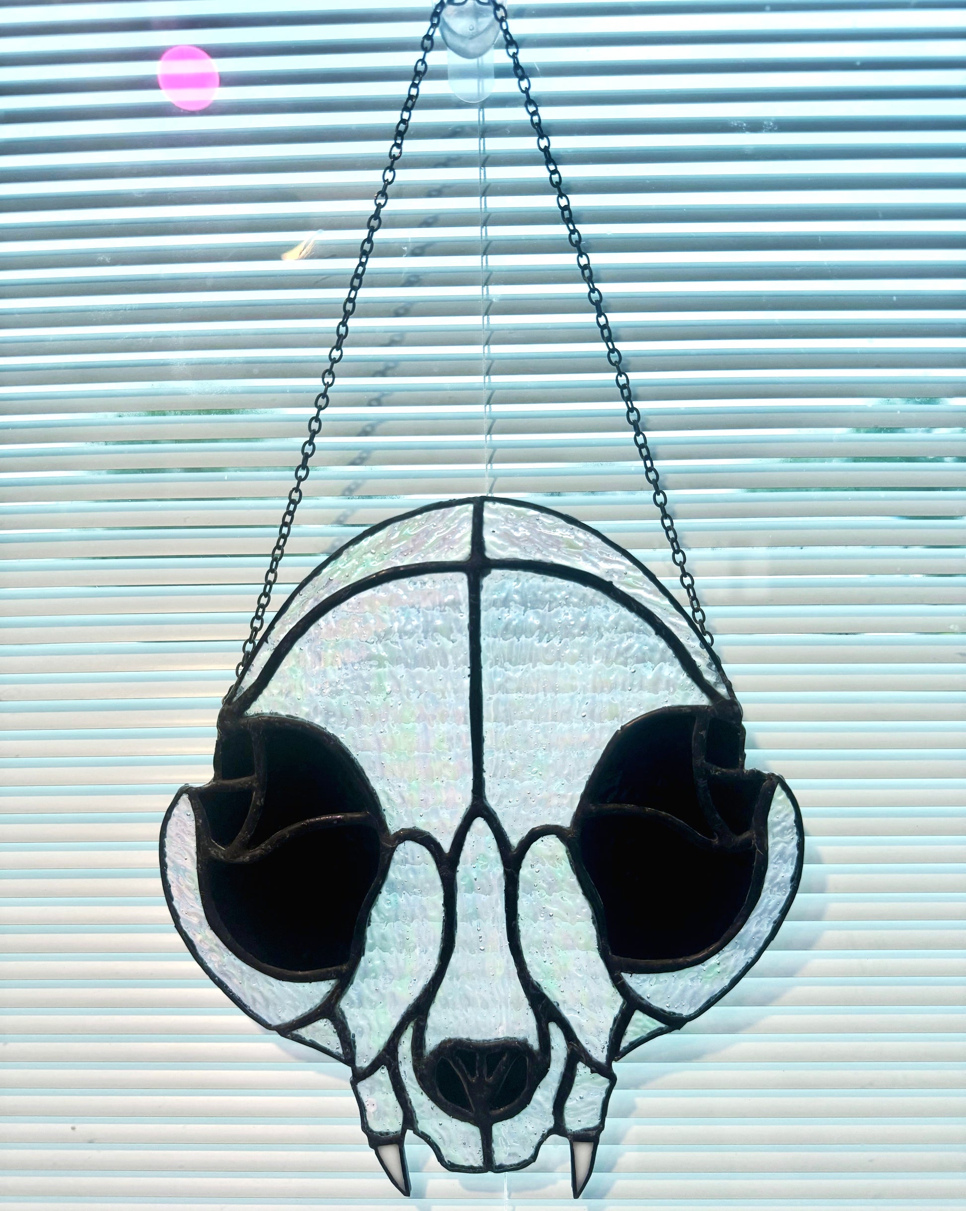 Clear Iridescent Cat Skull Stained Glass Suncatcher